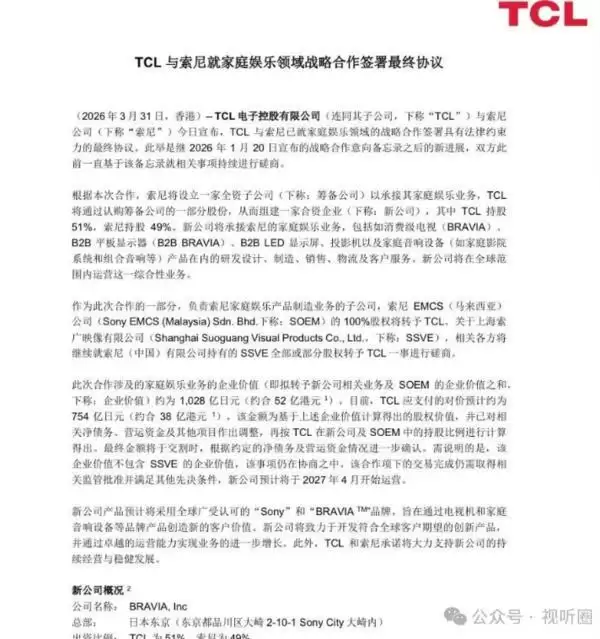 【CNMO科技消息】CNMO注意到,TCL电子控股与索尼集团于3月31日正式签署具有法律约束力的最终协议,宣告双方为期两个月的战略合作磋商尘埃落定。这笔总价值约1028亿日元(约合52亿港元)的重磅交易,标志着全球电视产业迎来历史性时刻——TCL将以约754亿日元(约38亿港元)的对价,获得新合资公司51%控股权,索尼持股49%。新公司定名BRAVIA, Inc.,总部仍设在日本东京。