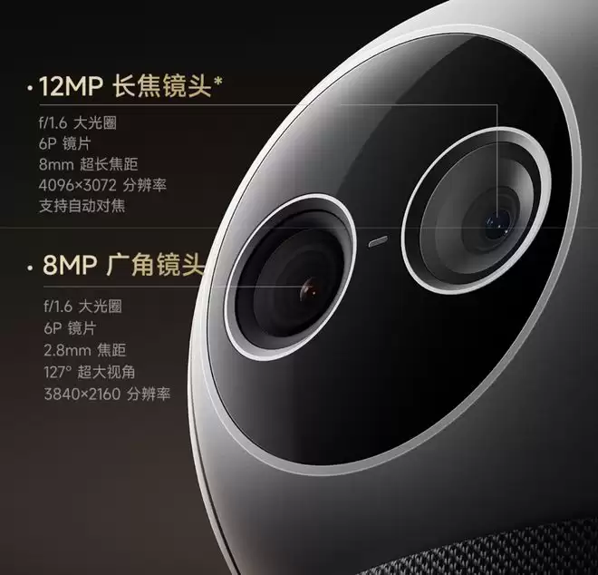 该机云台支持水平 360 度及垂直 180 度旋转,采用 12MP 长焦 + 8MP 广角设计,内置 10 颗红外补光灯,至高可实现 3 倍无损变焦、12 倍混合变焦,同时支持自动对焦及红外夜视。
