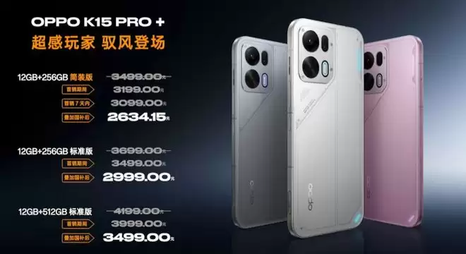 OPPO K15Pro+提供了12GB+256GB与12GB+512GB两个存储版本,首销期内提供200元优惠,首销价分别为3499元与3999元。12GB+256GB精简版同样提供限时优惠,首销7天内售价3099元。新机将在4月3日10点正式开售。