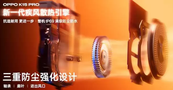 OPPO K15Pro全系搭载新一代疾风散热引擎,升级低阻风道与疏密错位散热鳍片,散热效率显著提升。采用三重防尘强化设计,进风口微凸不足1mm,整机通过IP69满级防尘防水,抗造耐用。风扇支持智能自启动与转速自适应调节,50%转速下噪音仅19dB,日常使用几乎无感。OPPO K15 Pro+额外配备疾风超神散热套装,40W超级冰翼磁吸散热器开机20秒表面温度可破 0℃,搭配透明视窗全域液冷磁吸壳,散热与颜值兼顾。
