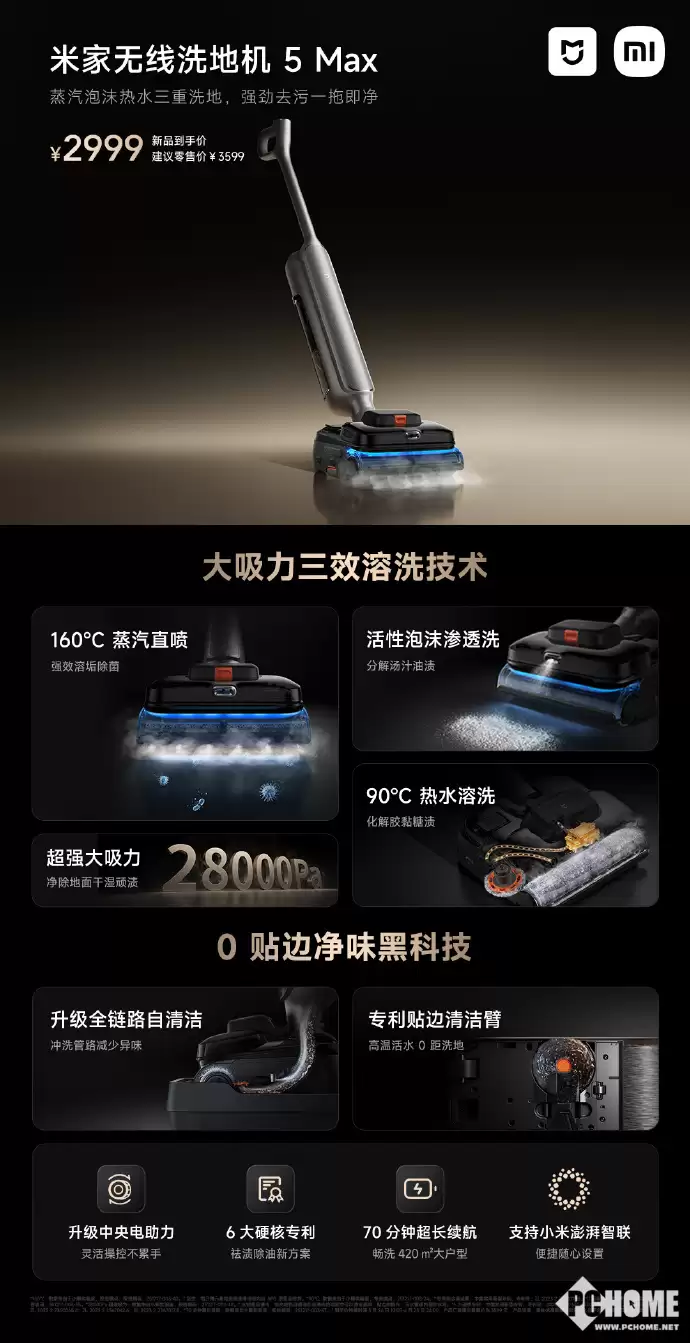 米家无线洗地机5 Max来了 支持蒸汽泡沫热水三重洗地