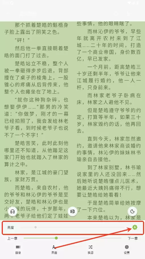 1、进入小说阅读界面,打开菜单栏。点击亮度右侧的A按钮。
