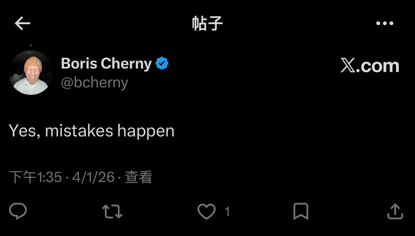 31日ClaudeCode源码泄露10余个小时后,4月1日13点,CC之父Boris终于公开回应: