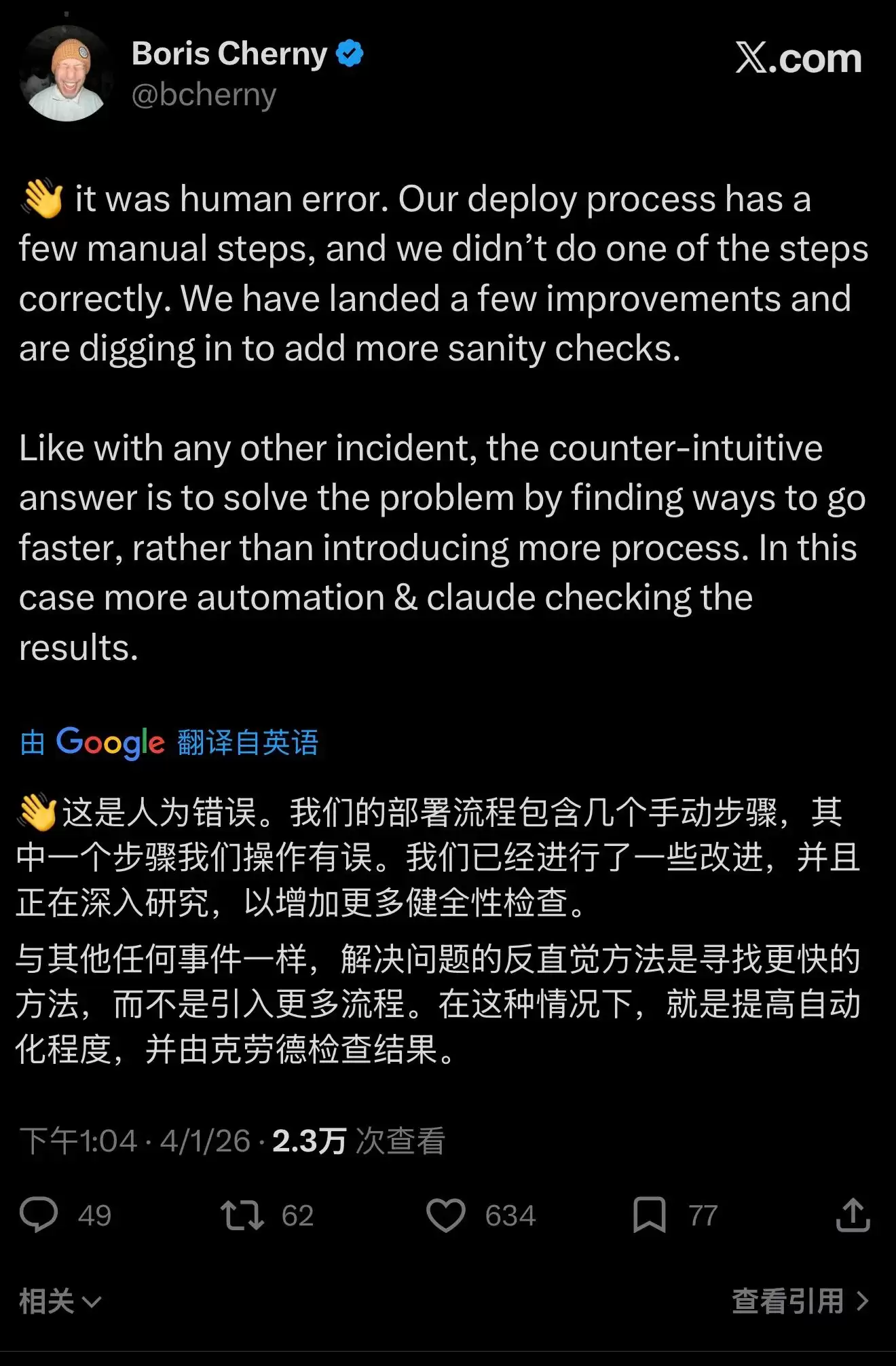 31日ClaudeCode源码泄露10余个小时后,4月1日13点,CC之父Boris终于公开回应:“这是人为错误。我们的部署流程中有一些手动步骤,而其中有一步没有正确执行。我们已经上线了一些改进措施
