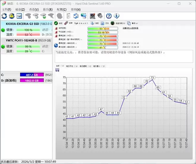 运行CrystalDiskMark的顺序读写测试,可以看到软件监测最高温度达到了73度,测试结束后温度下降也较为缓慢。
