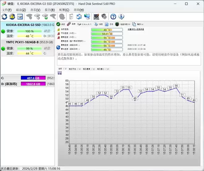 我们在进行CrystalDiskMark测试时记录下SSD的温度变化,可以看到在进行连续高强度读写操作之后,铠侠EXCERIA G3 SSD最高峰值温度只有56度,作为一个读写10000MB/s的PCIe 5.0 SSD,这个温度表现非常惊人。