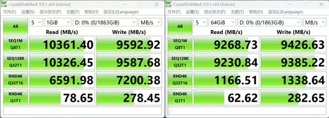 在CrystalDiskMark测试中,铠侠EXCERIA G3 SSD在1GB和64GB的测试的结果非常接近。顺序读取速度达到了10361MB/s,写入速度也有9592MB/s;4K随机读取78MB/s,4K随机写入278MB/s。