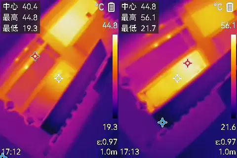 在热成像仪下,可以看到待机时铠侠EXCERIA G3 SSD的温度甚至没有旁边的主板芯片组温度高,SSD主控芯片只有40度左右,在读写操作时,主控芯片表面最高也只有56度,完全可以长时间放心使用。
