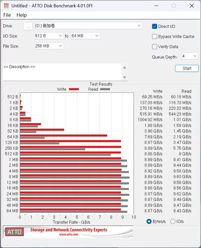 在ATTO Disk Benchmark测试中,铠侠EXCERIA G3 SSD在8K的时候,读写达到1GB/s。从64KB开始,写入速度稳定超过7GB/s,读取速度从512K开始达到8GB/s的速度。
