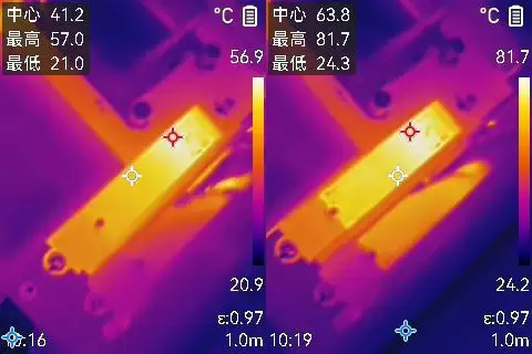 用热成像仪拍色无散热片保护的SSD,待机是主控芯片温度就已经高达57度,读写测试时更是突破了81度,已经很接近允许的工作温度极限85度,此时SSD极易损坏,我们测试完立刻就将散热片装回。