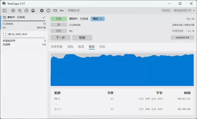 我们准备了300GB的文件夹,从主SSD中向铠侠EXCERIA G3 SSD中拷贝,由于我们测试平台使用的是PCIe 4.0 SSD,所以实际速度会略有影响但不大,因为实际速度距离接口理论速度还有较大差距。