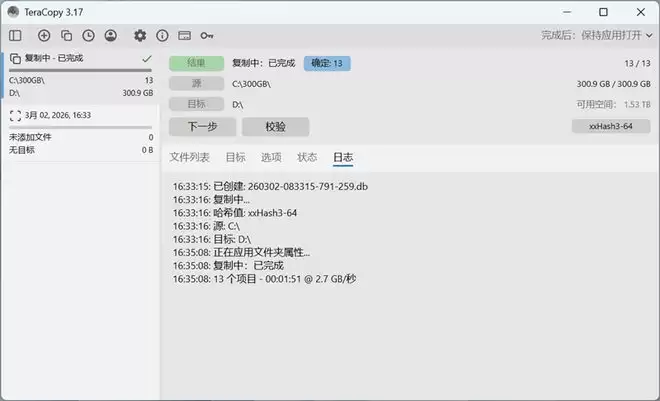 可以看到整个写入过程速度略有波动,平均速度了2.7GB/s,拷贝300G文件共耗时1分51秒,也比我们之前测试的旗舰PCIe 4.0 SSD更快一些。