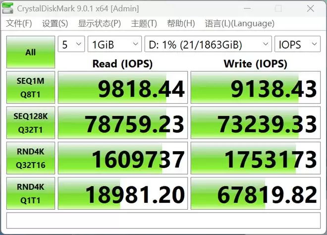 铠侠EXCERIA G3 SSD的4K随机读取超过1600K IOPS,写入甚至超过了1750K IOPS。