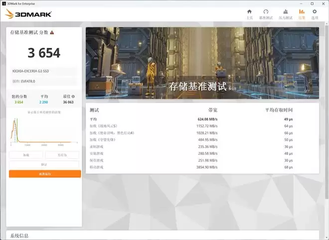 铠侠EXCERIA G3 SSD在3Dmark储存基准测试中,成绩为3654。