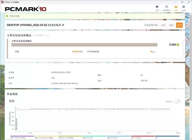 铠侠EXCERIA G3 SSD在PCMark10的完整系统盘基准测试中,成绩为3434。