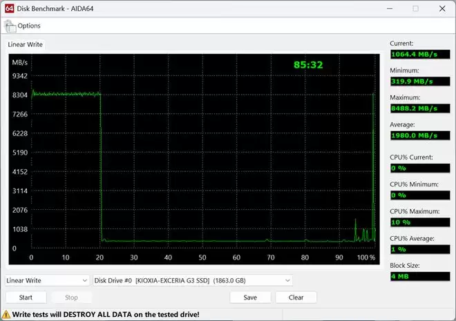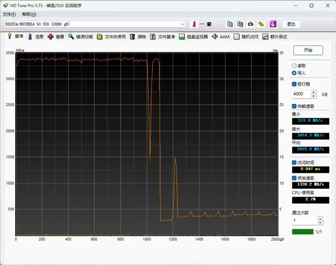 铠侠EXCERIA G3 SSD在AIDA64储存基准测试中进行线型写入测试,这个测试会一直写入直到写满为止,无文件系统的情况下,可以测试SSD在不同剩余容量时的真实写入速度。