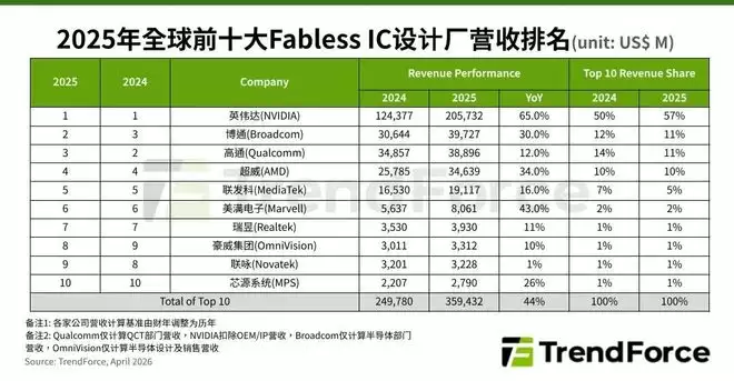 智通财经APP获悉,根据TrendForce集邦咨询最新调查,2025年各大云端服务供应商(CSP)持续购买GPU、自研ASIC建置算力需求,带动AI相关芯片设计业者成长,全球前十大无晶圆IC(Fabless IC)设计公司合计营收逾3,594亿美元,年增44%。NVIDIA(英伟达)蝉联营收冠军,Broadcom(博通)因受惠AI浪潮较深,排名上升至第二名,超过消费性电子营收占比较高的Qualcomm(高通)。