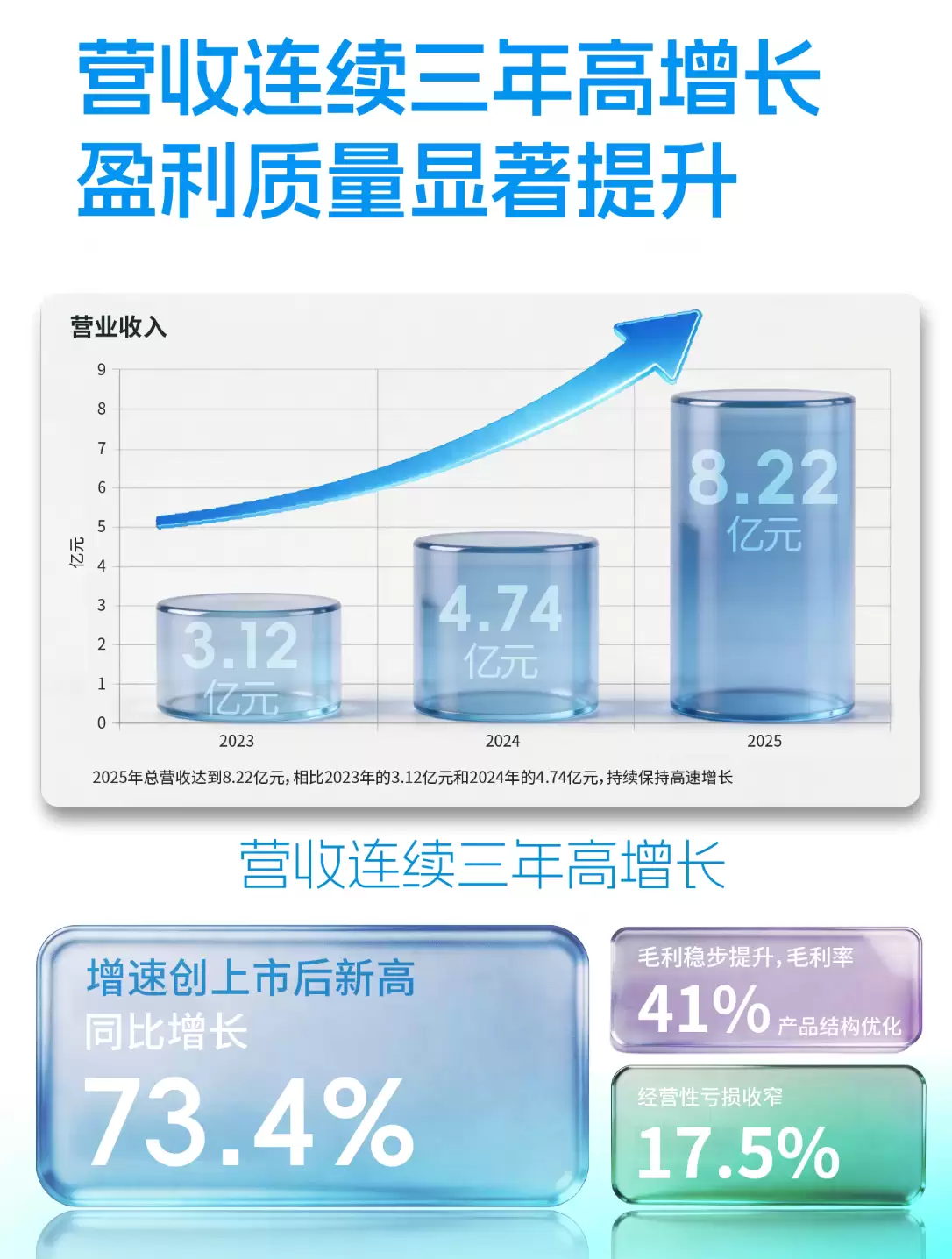 财报显示,黑芝麻智能2025年营收8.22亿元,同比增长73.4%,连续三年保持高速增长态势,增速更是大幅跑赢行业平均水平;⽑利亦同比增长71.1%至3.37亿元,毛利率为41.0%保持稳定。