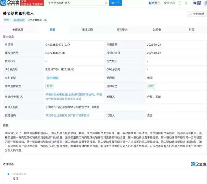 企查查APP显示,近日,宁德时代未来能源(上海)研究院有限公司、宁德时代(300750 SZ)申请的“关节结构和机器人”专利获授权。企查查专利摘要显示,本申请涉及机器人技术领域,其中,关节结构包括关