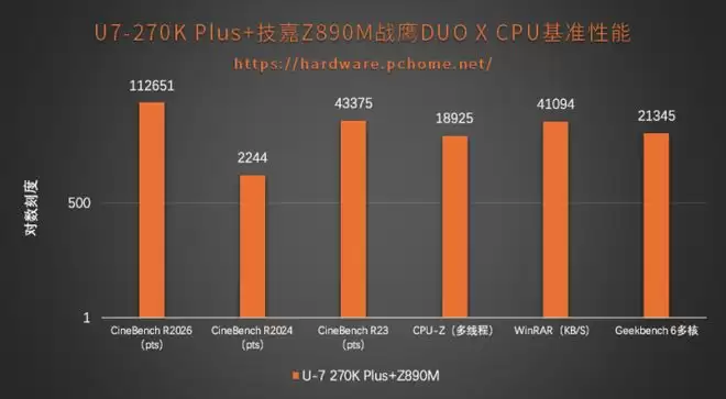 在CINEBENCH系列基准测试的CPU测试中,酷睿Ultra 7 270K Plus在CINEBENCH 2024/2026版本中,多核成绩分别高达2244 pts和112651pts ,常用的R23版本中CPU单核成绩为2428 pts,多核成绩高达43375 pts,均处于目前消费者处理器的领先水准,在技嘉Z890M战鹰DUO X主板上发挥出色。
