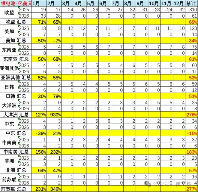 智通财经APP获悉,乘联分会秘书长崔东树发文称,2026年,锂电池作为我国“新三样”出口的优势品类,出口退税减少前的增速保持高位。2026年1-2月锂电池出口达到142亿美元,增46%。与同为“新三样”的太阳能电池出口低迷、行业内卷加剧的态势形成鲜明对比,锂电池出口凭借多元的市场布局实现了韧性增长。