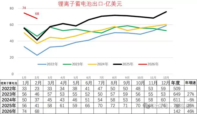崔东树:2026年1-2月锂电池出口达到142亿美元 同比增46%