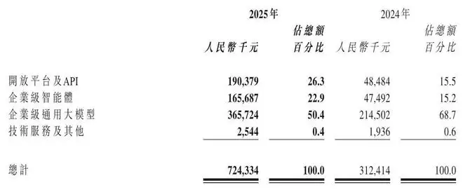 智谱2025年开发平台收入为1.9亿元,占营收的比例为26.3%;企业级智能体的收入为1.66亿元,占比为22.9%;企业级通用大模型收入为3.65亿元,占比为50.4%。