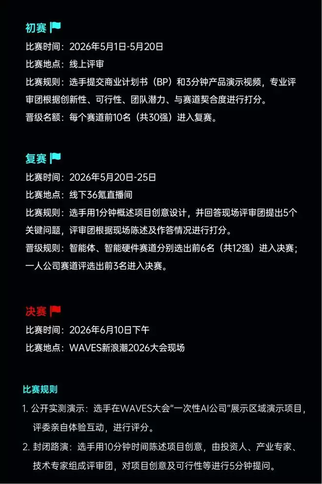 行至决赛,你会站上WAVES的舞台,这是中国创投圈最重要的舞台之一,台下坐着投资人、产业伙伴、未来的用户,过去很多你叫得出名字的创业者,都是从这里被看见、被理解、被加速。2026年夏天,我们想把这个舞台分你一半。