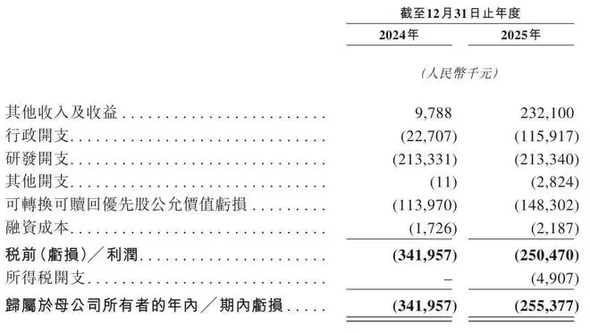招股书显示,靖因药业2024年、2025年其他收入及收益分别为979万元、2.32亿元;期内亏损分别为3.42亿元、2.55亿元。