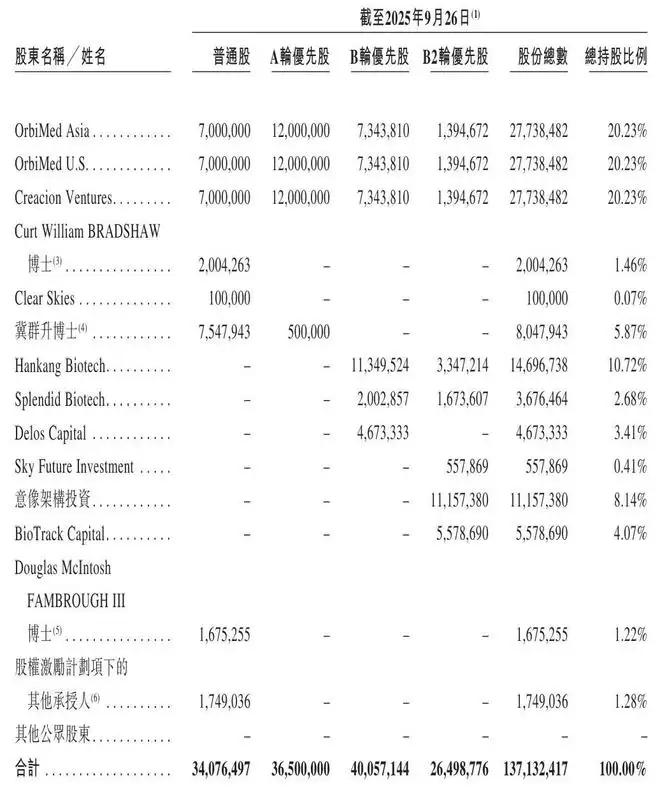 腾讯旗下意像架构投资持股为8.14%,BioTrack Capital持股为4.07%,Douglas McIntosh FAMBROUGH III博士持股为1.22%,股权激励计划项下的其他承授人持股为1.28%。
