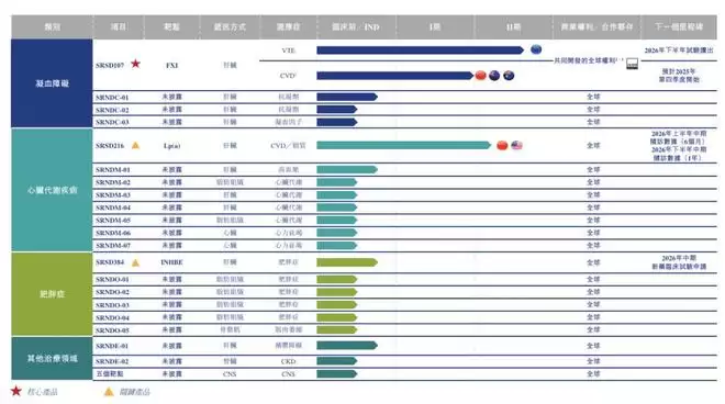 靖因药业的管线分为三大核心管线产品组合:凝血功能障碍管线产品组合,包含可能重新定义抗血栓治疗安全性及便利性的下一代候选药物;心脏代谢疾病管线产品组合,通过针对血脂管理、高血压和心血管疾病的方案解决高患病率疾病;以及肥胖症管线产品组合,包含多项资产。