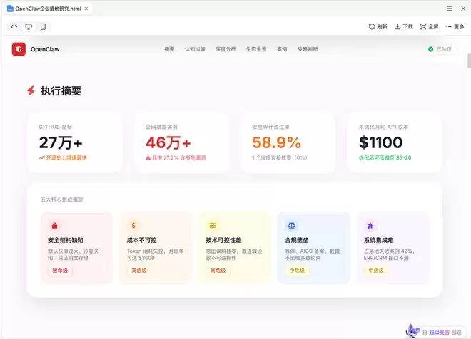 比如,用户输入指令“帮我深度调研一下OpenClaw在企业落地的现状与挑战”,传统RPA必须要提前写好规则去哪个 、点哪个按钮、爬哪一列字段、存到哪个表格,而且只能做复制公司名称、粘贴到 Excel等固定、重复动作。相比之下,超级麦吉不仅能够理解用户意图并不是简单爬数据,还能把意图拆解成可执行的任务,去筛选企业、收集整理信息,最终交付的不是一堆抽象数据,而是整理好的报告和趋势分析。