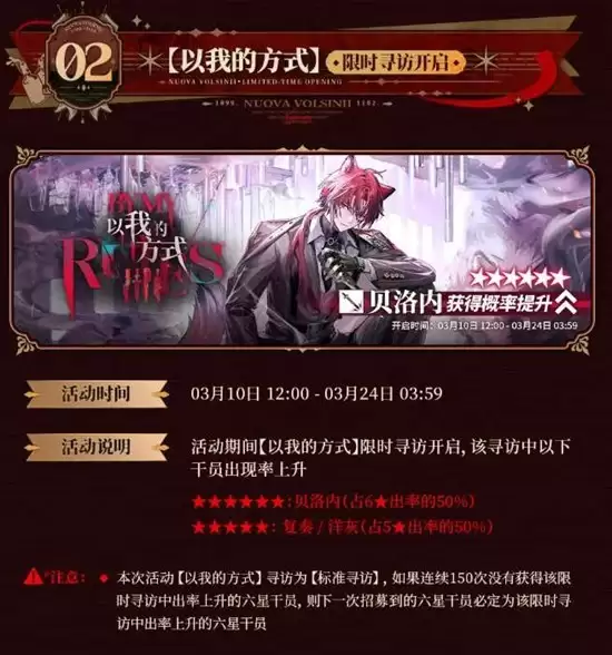 本次限时寻访的开放时间为:3月10日16:00至3月24日03:59。活动期间,「以我的方式」寻访卡池限时启动,全新登场的六星干员与五星干员的获取概率将获得显著提升,各自占据对应星级出率的50%。