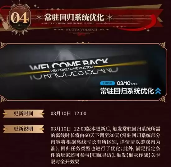 本次更新对游戏内的常驻回归系统进行了全方位的优化调整。旨在改善回归玩家的游戏体验,提供更清晰的新版本指引与更丰厚的回归奖励,助力阔别战场的博士们能够迅速适应最新版本环境,无缝衔接主线进度。