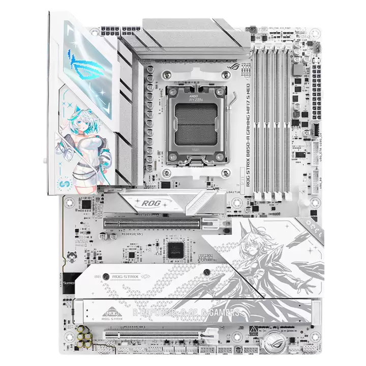 在外观设计上,这款主板将“全白美学”贯彻得淋漓尽致。PCB基板、插槽接口以及供电区域的厚重散热装甲均采用了统一的白色涂装,营造出纯净整洁的视觉感受。其I/O护甲上特别设计的“吹雪姬”双层立绘,是国行版本的独有亮点,结合流动曲线光纹铭板和AURA SYNC神光同步ARGB灯效,为主板增添了鲜明的二次元风格与个性化灯效可玩性,为整机颜值奠定了出色基础。