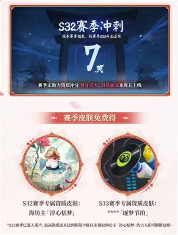 S33赛季开启在即,这也意味着S32赛季已进入收官倒计时。官方特别提醒:本赛季的专属段位奖励皮肤——海坊主「淳心恬梦」将伴随版本更新永久绝版,不再返场。这款皮肤象征着S32赛季的荣誉与回忆,尚未达到领取段位的玩家请把握最后机会,全力冲刺。同时,S33赛季的全新资质皮肤情报也已放出,新款皮肤命名为「逐梦节拍」,定位四星品质,设计灵感源于音乐节拍与舞台魅力,专为某位人气式神打造,造型备受期待。