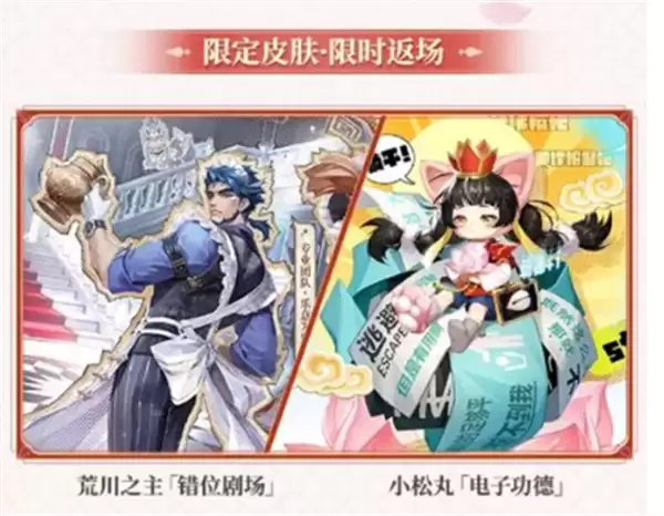 值此赛季更替之际,两款人气限定皮肤将限时返场上架,分别是荒川之主「错位剧场」与小松丸「电子功德」。这两款皮肤因其独特的设计与主题深受玩家喜爱,本次返场为错过此前获取机会的玩家提供了珍贵的弥补时机,感兴趣的玩家请务必关注商城动态。
