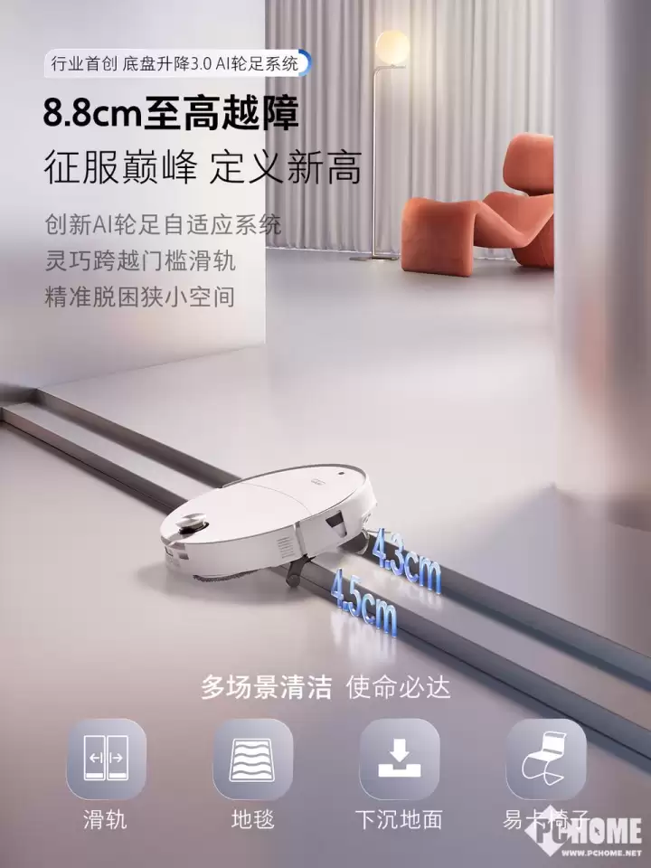 对多数家庭而言,门槛与厚地毯是扫地机器人长期面临的两大挑战。以往产品多依赖驱动轮简单抬升来应对障碍,一旦遇到稍高门槛或柔软厚地毯,往往难以通过。