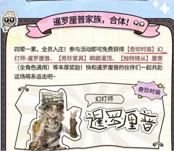 盲盒玩法还设计了创新的“连线解锁”规则。当玩家成功点亮活动界面中任意一整行的所有盲盒后,即可免费领取该行对应的专属宝箱。宝箱内包含全角色通用的【独特随从】“厘普”、联动限定【头像框】与【头像】以及专属【涂鸦】。而集齐所有盲盒的终极成就,更能直接免费获得本次联动的核心大奖——【奇珍时装】“幻灯师-暹罗厘普”。
