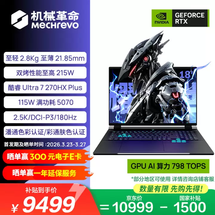高配版:核心搭载英特尔Ultra 7 270HX Plus处理器,搭配NVIDIA RTX 5070独立显卡。首发定价为10999元,若参与国家以旧换新补贴活动,实际到手价可降至9499元。