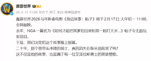 《魔兽世界》2026马年新春电影正式官宣:取材真实玩家故事,致敬二十年热血青春 暴雪官方今日发布了令人振奋的消息:《魔兽世界》2026马年新春特别电影《身边故事:帖子》已正式定档,将于2月17日(农历大年初一)上午11点,在各大视频及流媒体平台同步全球首映。这部影片最大的亮点在于其创意源头——它并非