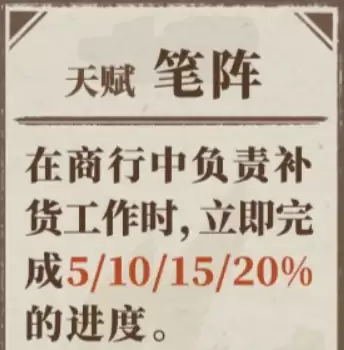卫铄的核心定位是顶级的“理财”专家。其专属天赋「笔阵」效果直接且强大:当她被派遣至任意商行执行“补货”任务时,能立即减免部分任务所需时间。初始等级即可节省5%的等候时长,随着角色星级的提升,该减免比例最高可成长至20%。这一特性在游戏后期,当玩家产业规模扩大、补货队列漫长时,其价值将愈发凸显,能显著优化你的生产循环,堪称提升商业效率的时间管理神器。