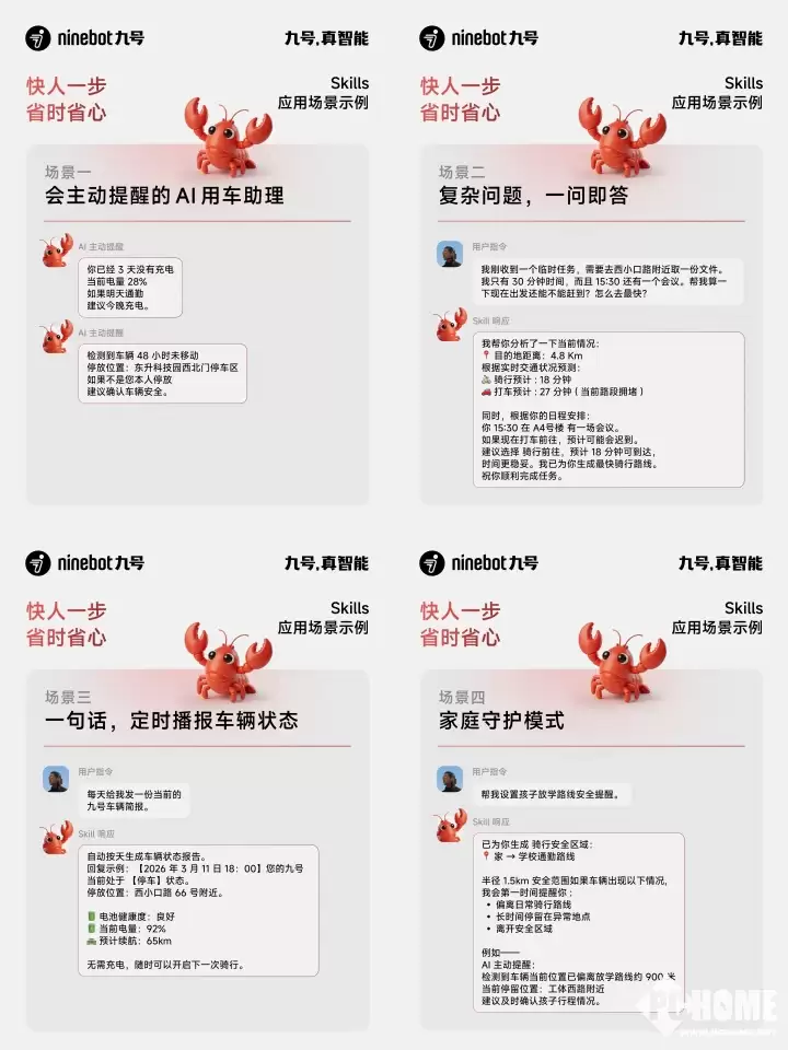 根据官方公布的计划,九号OpenClaw内测将于3月13日正式启动。未来用户可通过自然对话与车辆交互,AI将理解复杂的出行需求,并提供涵盖车辆状态分析、智能提醒、行程规划等全方位服务。