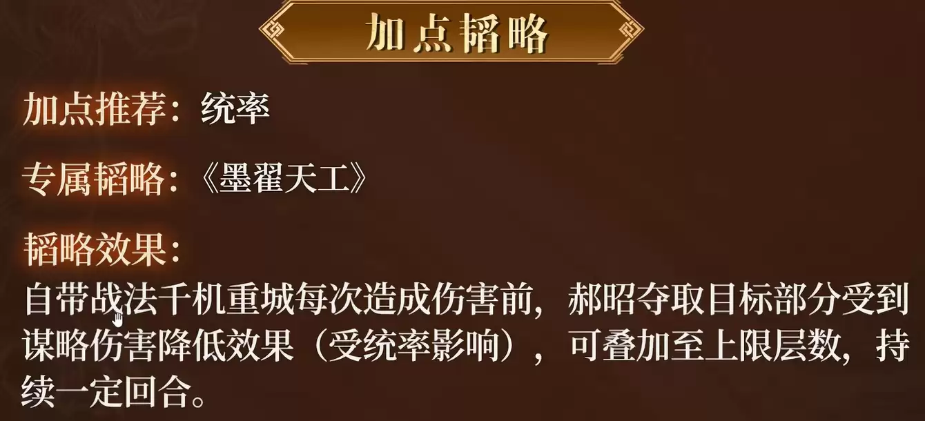 在属性加点的选择上,郝昭必须优先提升统率。【千机重城】战法的所有核心效果——包括抵御触发概率、伤害减免比例以及谋略伤害增幅——其强度均与郝昭的统率属性直接相关。因此,将大部分属性点投资于统率,是最大化郝昭战场作用、提升整个队伍生存与输出能力的唯一正确方向。高统率能让他的防御体系更加稳固,反击也更加致命。