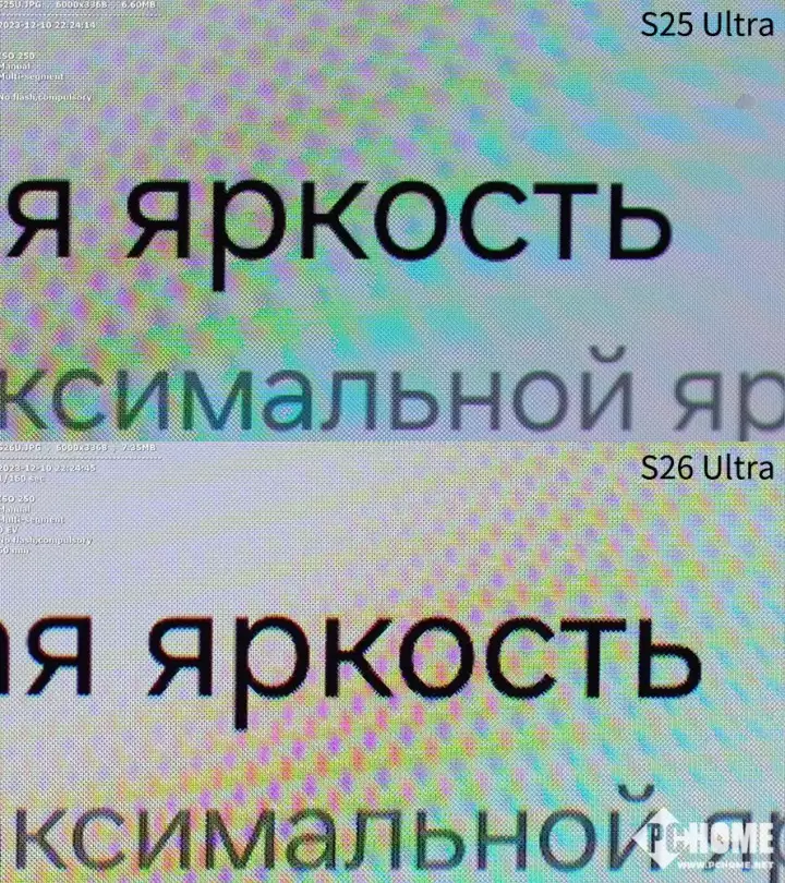 如果将观察距离拉近,聚焦于显示的精细度,差异则更为明显。在与前代旗舰Galaxy S25 Ultra的显微镜级对比中,S26 Ultra显示的字体边缘锐利度稍逊,细腻感略有降低。在呈现大面积纯色背景,特别是中性灰色时,S25 Ultra展现了更优秀的色彩均匀性,而S26 Ultra则在部分区域出现了轻微的色调偏差。