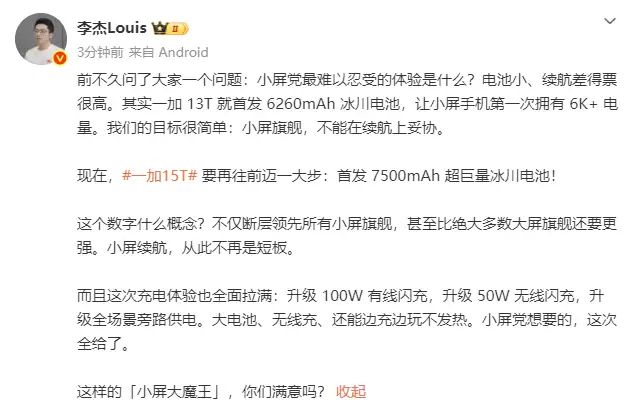 近日,一加中国区总裁李杰Louis向外界透露了一个重磅消息:即将发布的小屏旗舰一加15T,将率先搭载一块容量高达7500mAh的超大容量冰川电池。这一突破性进展,预示着长期制约小屏手机的续航瓶颈,有望被彻底解决,为追求便携手感的用户带来前所未有的安全感。