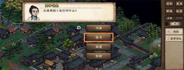 3、根据剧情指引,你需要寻找一位卖书先生,他位于坐标(12,5)。向他打听「医书」相关消息,经历剧情后,在关键词选择中点击「药师」。随后,前往坐标(16,14)找到葛药师,并向他打听关于「五色梅」的线索。