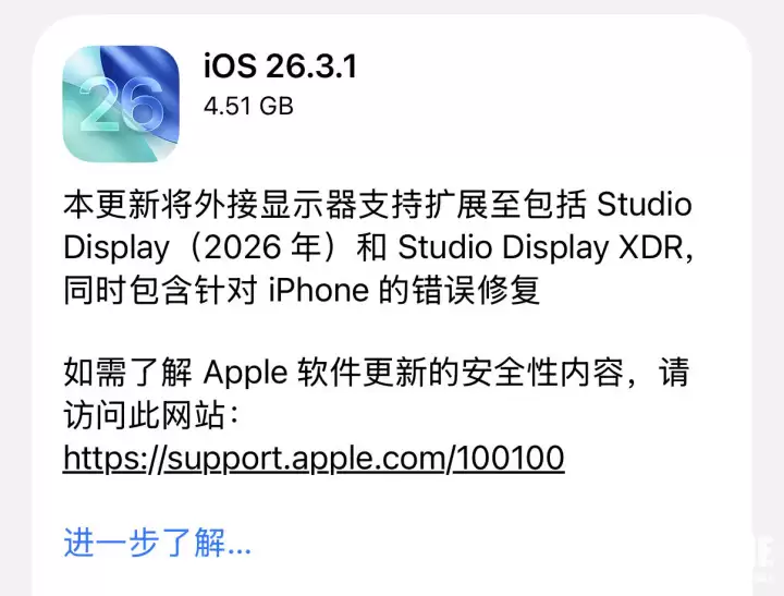 苹果iOS 26 3 1正式版更新详解:专攻外接显示器支持,国行AI功能何时到来? 苹果iOS系统新一轮更新如期而至。本次推送的iOS 26 3 1正式版,与外界预期一致,并非一次功能上的重大迭代。它的定位非常清晰:不追求功能数量的堆叠,而是侧重于“问题修复与体验完善”,旨在通过修补已知漏洞和优化现