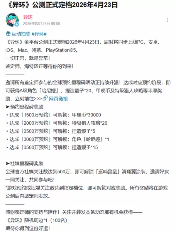 消息来了!由完美世界旗下Hotta Studio倾力打造的二次元都市开放世界RPG《异环》,今日正式宣布,其全平台公测时间锁定在2026年4月23日。这个日子,注定会成为不少玩家日历上的标记。届时,无论你偏好哪种设备,都能无缝接入这个幻想世界——游戏将同步登陆PC、安卓、iOS、Mac、鸿蒙以及PS5平台,真正实现“一处预约,全端畅玩”。这无疑是为广大玩家铺开了一张通往广阔二次元都市的自由探索地图。