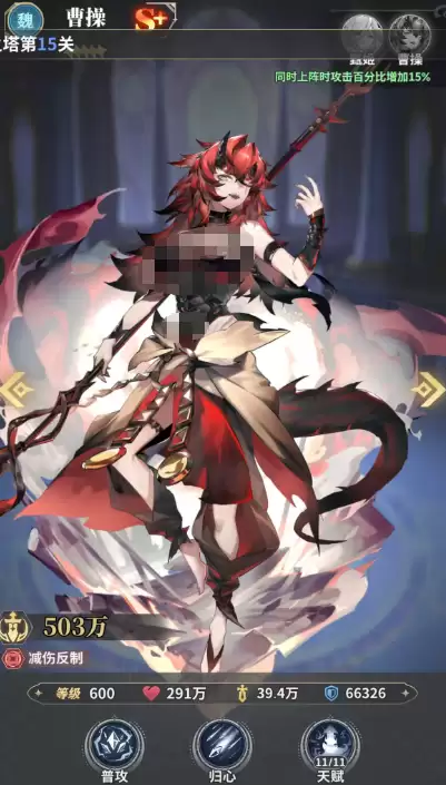 另一位核心支柱曹操,同样具备出色的群体打击能力,可造成80%的全体伤害。她的核心价值在于强大的团队光环:释放技能后,能直接提升我方全体30%的减伤比例。与司马懿的减伤能力叠加后,队伍的防御体系将极为稳固。此外,曹操还拥有守护机制,可在后排队友面临致命单体伤害时挺身承担。随着星级提升,其个人减伤能力大幅增强:九星解锁天赋后,每层效果可提升3%减伤,最高可叠加至惊人的60%。这让她成为攻守兼备的团队基石。